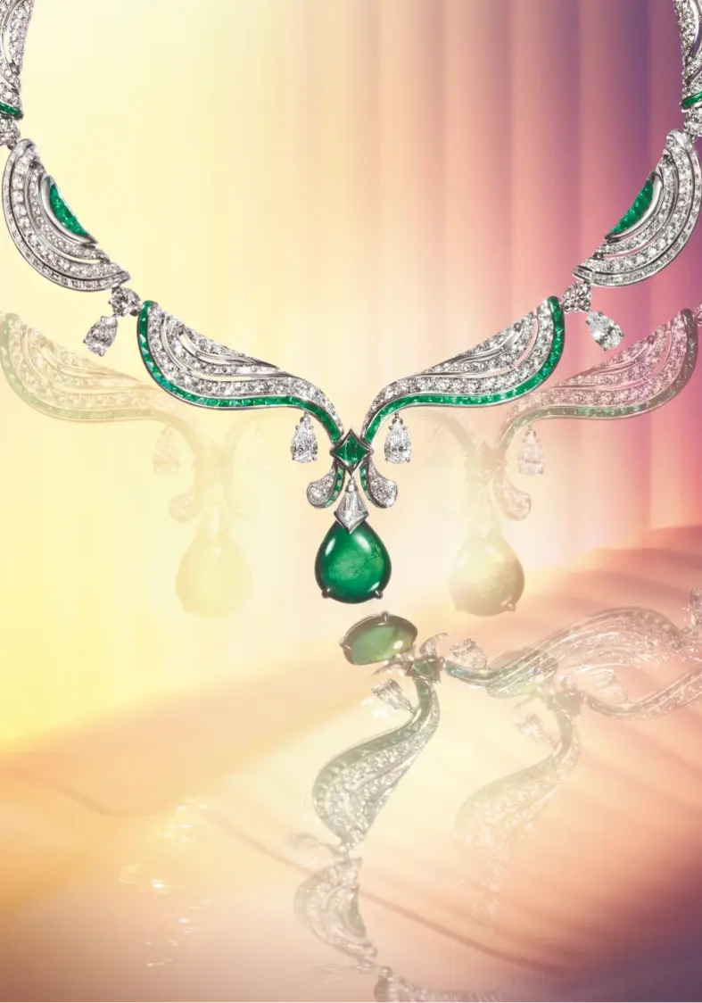 The collection also includes the Sapphire Aeterna Waves necklace, decorated with diamonds and sapphires, and the Sapphire Brocade ornament, which features thirteen cushion-cut sapphires and buff-top-cut emeralds. The Aurea Chandra choker reimagines a cult line from the 1980s, while the Tubogas Flower of Time necklace showcases a Zambian emerald weighing 31.07 carats, accompanied by shimmering diamonds. The necklace comes with matching earrings.